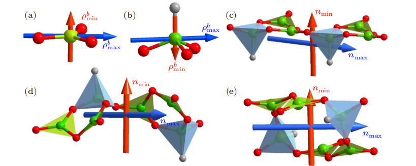 (a) 孤立的BO₃基团和 (b) 孤立的BO₃F基团(B–O键长短于B–F键长)的键合电子密度(ρb)分布示意图,图中标出了其最大值(ρₘₐₓᵇ)和最小值(ρₘᵢₙᵇ)的方向。(c)-(e) 不同基团排列方式下,键合电子密度(ρb)在光学主轴(nₘₐₓ和nₘᵢₙ方向)上的投影示意图:(c) BO₃与BO₃F基团共面排列(如CaB₃O₅F-II),(d) BO₃基团平面相互垂直(如CaB₃O₅F-V),(e) BO₃基团共面但BO₃F基团与之垂直(如CaB₃O₅F-VI)