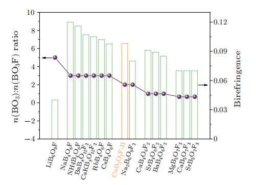 具有不同BO₃与BO₃F比例(5:1 3:1 2:1 1:1 2:3)的氟氧硼酸盐的双折射率对比。其中代表2:1比例的材料即为本研究预测的CaB₃O₅F-II