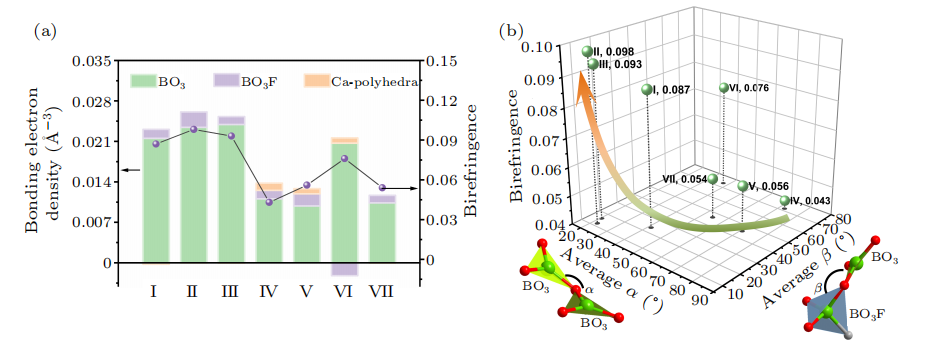 (a) 七个预测的CaB₃O₅F结构中,不同基团对双折射率的贡献占比。(b) 七个结构中BO₃基团平面间的平均二面角(α,红色)以及BO₃平面与BO₃F基团底面间的平均二面角(β,蓝色)与双折射率的关系图