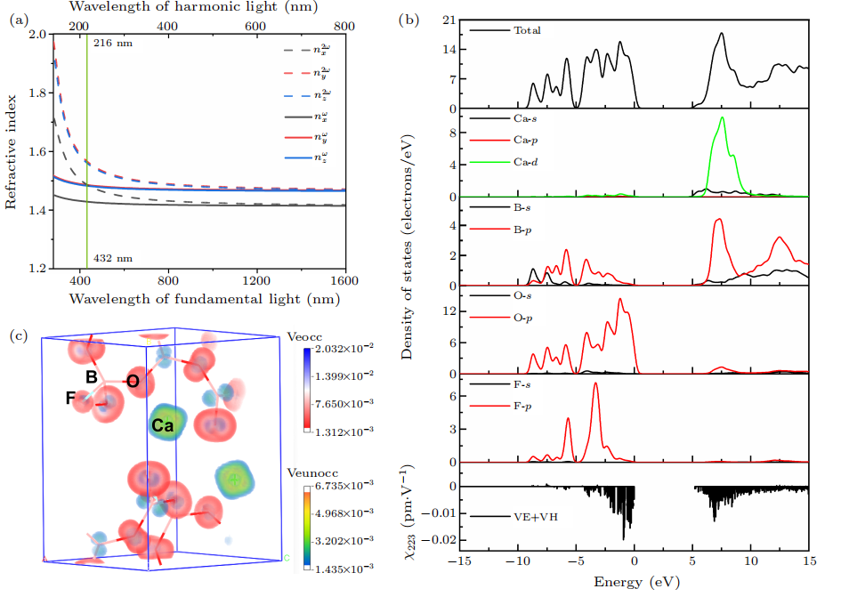 (a) CaB₃O₅F-VII的折射率色散关系及其最短SHG相位匹配波长(λPM)。(b) CaB₃O₅F-VII的态密度(DOS)和能带分辨的二阶非线性极化率(χ²₂₃₃)。(c) 在虚电子(VE)过程中,CaB₃O₅F-VII的已占据和未占据态SHG密度
