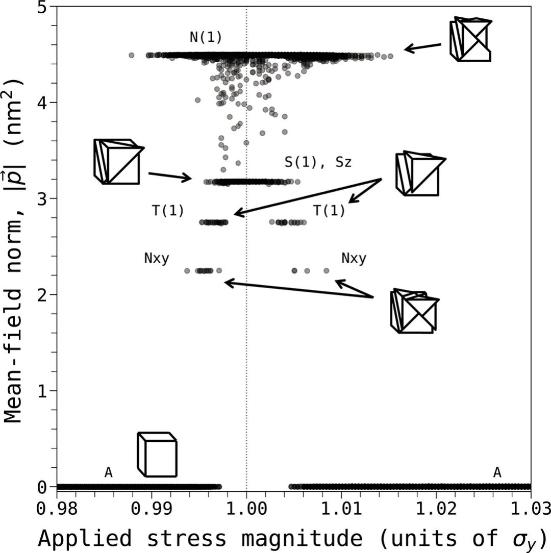 塑性连续统模型不能捕捉微观结构演化的丰富性,因为连续统是一种同质结构。目前的研究表明,在中尺度上,在真正离散的结构和离散的外部演算中,有一种替代方法是可用的。将已有的含两个参数的连续平均场模型用后者的语言重写,以模拟完美铜单晶在单轴拉伸作用下的塑性滑移事件网络的性质。采用Metropolis-Hastings算法在三维空间的二维三角形网格中模拟了系统的行为。不同性质的相出现,并观察到一阶和二阶相变。这些相代表了共线、共面、非共线和非共面主动滑移体系不同组合的塑性滑移网络排列。此外,这些相中的一些可以解释为代表晶体学现象,如二次滑移系统的激活,应变局部化和断裂或非晶化。一阶过渡主要作为外加应力的函数,而二阶过渡只作为平均场耦合参数的函数。前者让人想起其他统计力学模型中的过渡,而后者在实验观察中发现了相似之处。