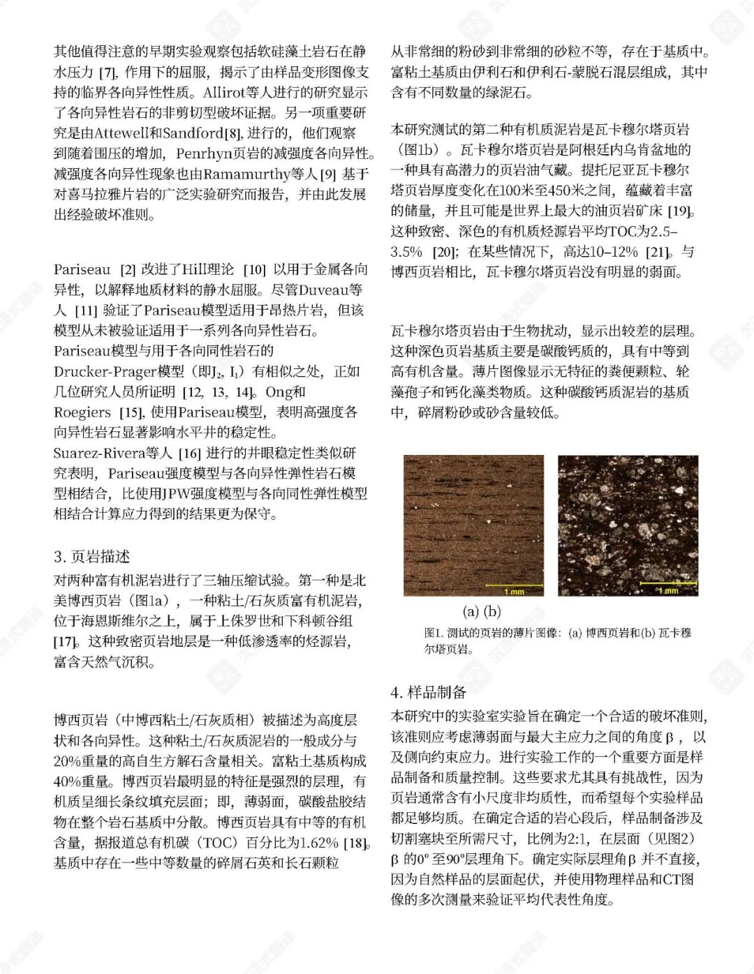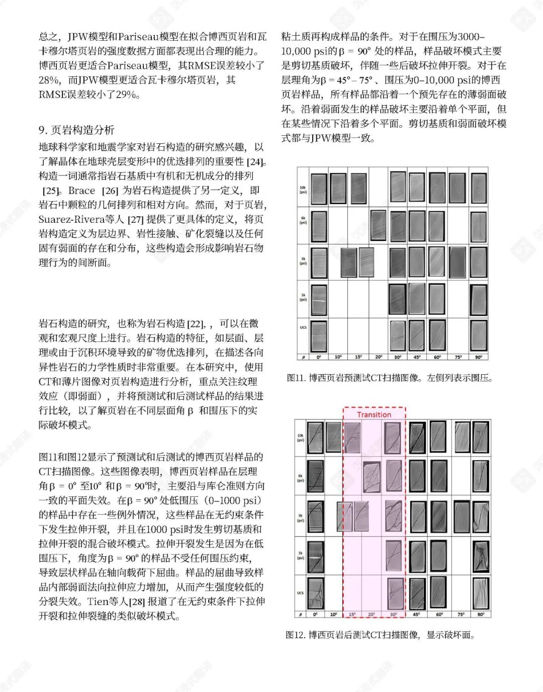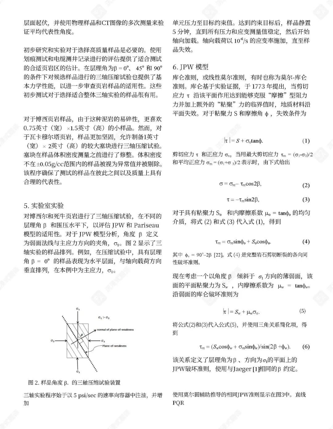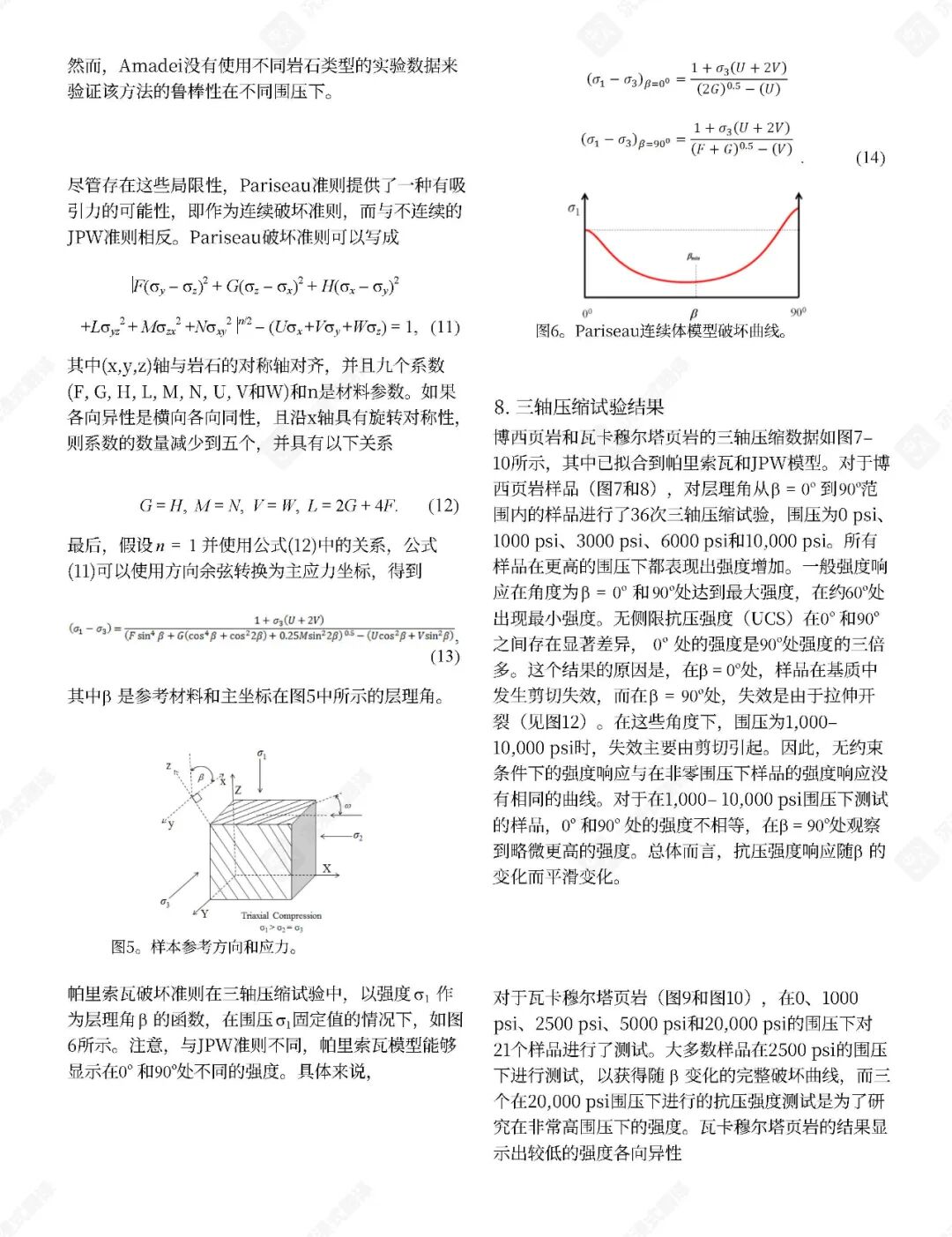 已提出了几种经验性破坏判据来预测页岩在各种应力状态(包括三轴和多轴压缩)下的极限强度。这些判据通常包含围压、层理倾角和不连续性等因素。孔隙空间内气体的存在也起着关键作用,因为孔隙气体可以显著影响岩石强度。例如,在含气砂质页岩中,有效应力系数随围压增加而降低。不连续面内部充填物对三轴应力下岩石破坏机制的影响也已被研究,结果表明这些充填物可能充当弱面。