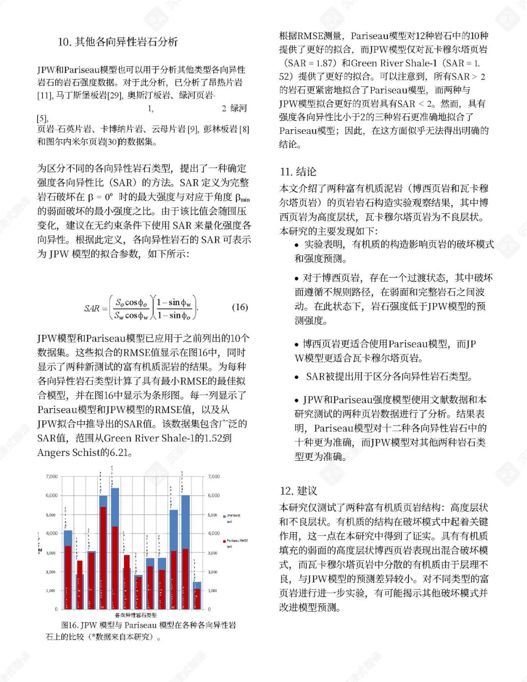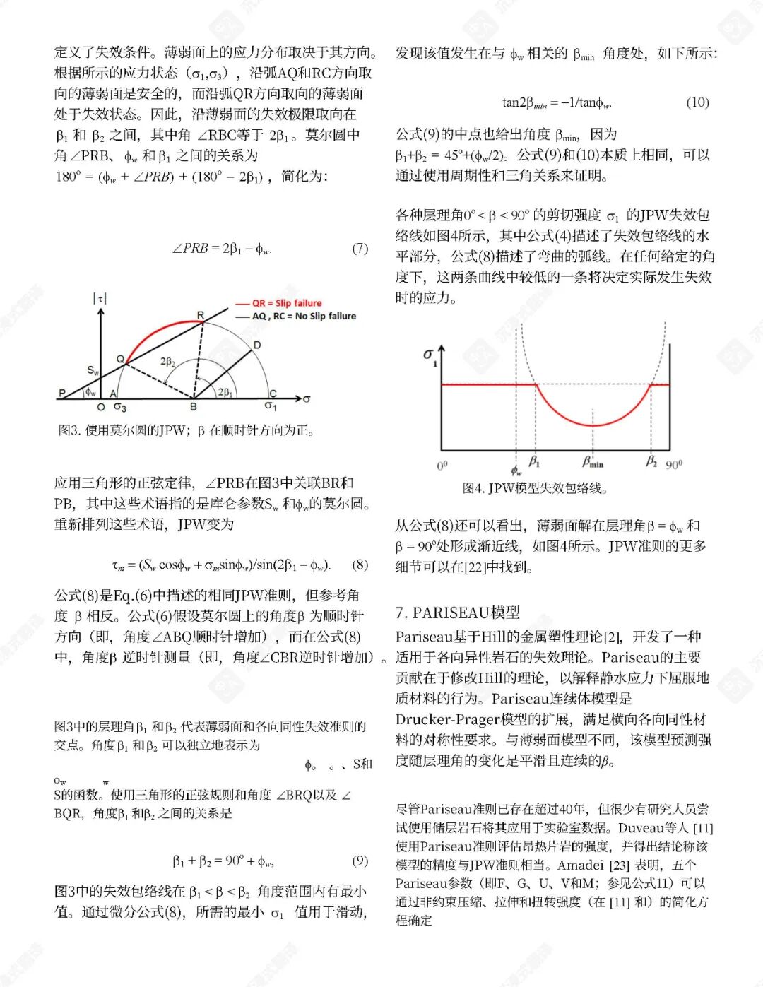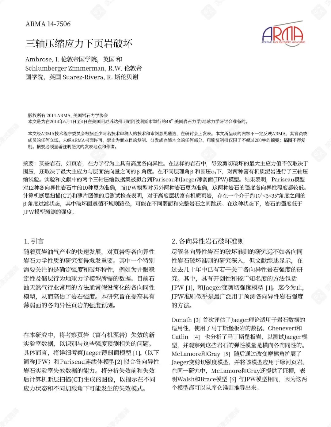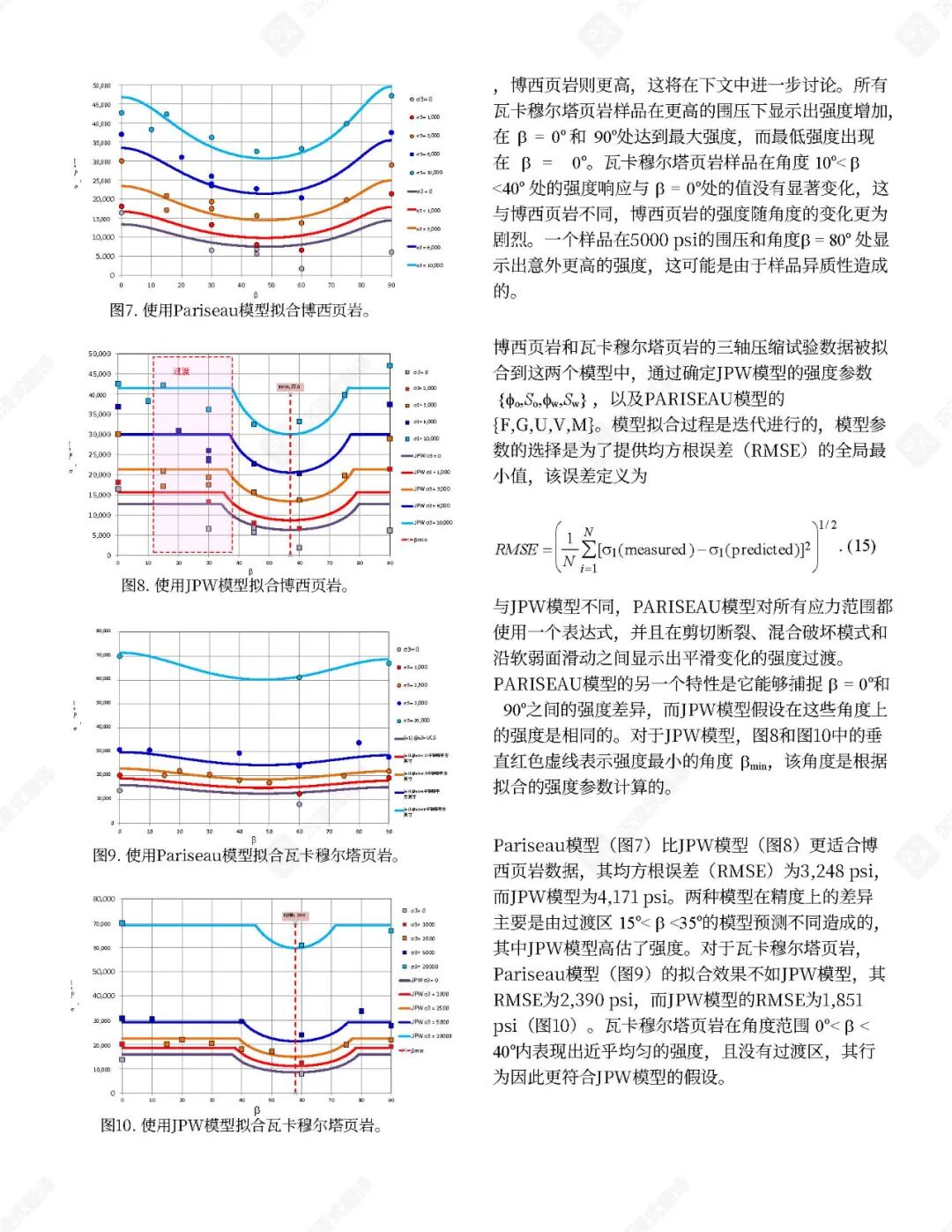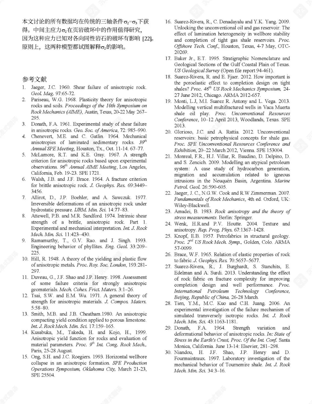 已提出了几种经验性破坏判据来预测页岩在各种应力状态(包括三轴和多轴压缩)下的极限强度。这些判据通常包含围压、层理倾角和不连续性等因素。孔隙空间内气体的存在也起着关键作用,因为孔隙气体可以显著影响岩石强度。例如,在含气砂质页岩中,有效应力系数随围压增加而降低。不连续面内部充填物对三轴应力下岩石破坏机制的影响也已被研究,结果表明这些充填物可能充当弱面。