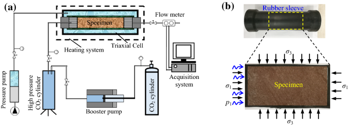 页岩是一种横观各向同性材料,这意味着其力学性质随方向而异。层理面的存在显著影响页岩的破坏模式和力学性质。对龙马溪组页岩的研究表明,层理倾角(如0°、30°、45°、60°、90°)对其在三轴条件下的脆性和破坏模式起着关键作用。例如,湖南页岩的实验表明,层理方向和围压都显著影响各向异性,包括强度、变形和声发射(AE)响应。在不同围压下,不同的层理方向可能导致多达五种不同的破坏模式。在地下工程中常见的横观各向同性碳质页岩含有层理面和裂隙等缺陷,这些缺陷是裂纹扩展和最终破坏的潜在来源。超深层页岩的各向异性力学性质已被研究,结果表明,在原地应力条件下,0°和90°等层理方向会影响其力学行为、脆性和各向异性。下图展示了研究材料性质的典型实验装置,包括与页岩相关的三轴压缩试验: