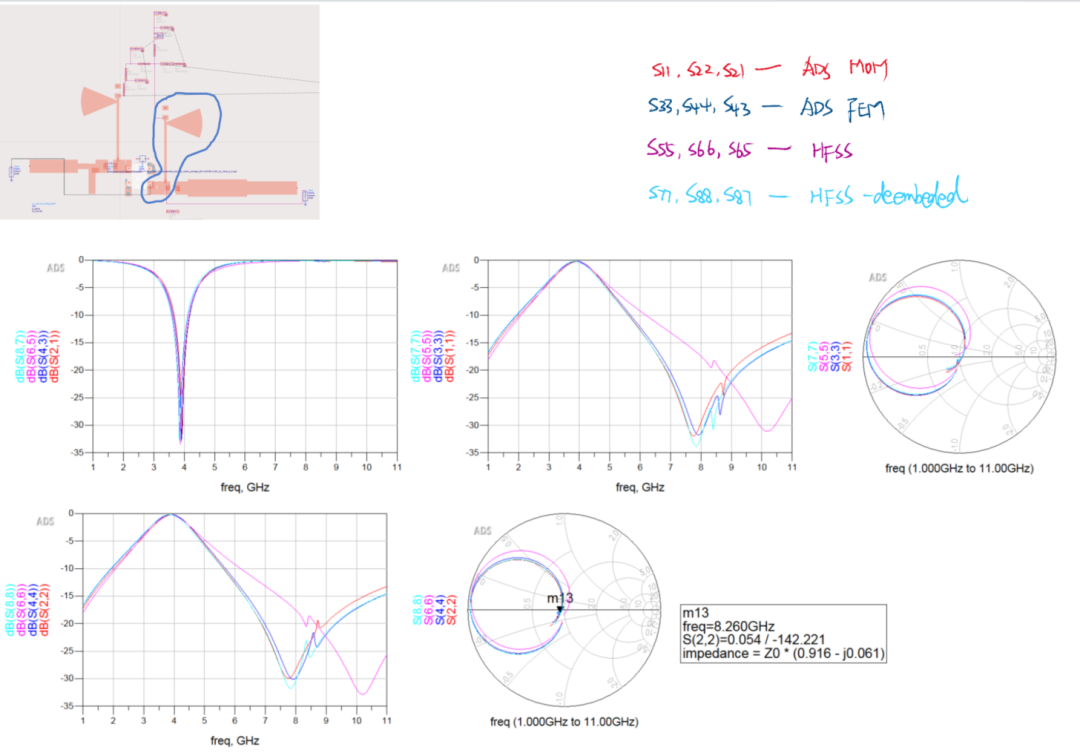 我说,ADS里面差不多了,我要把版图放到HFSS里面去仿真一下。HFSS,还是我家老大3岁多的时候,用过。当时接了一个Ku波段的高频多层板的项目,纠结插座的选型,仿了一把。现在老大已经11岁了,8年期间,没记错的话,应该都没碰过HFSS了,所以那是相当的不熟悉了。装的是2022版本。我用的功能也不多,就是建模,加端口,设置setup,看结果。性能一下子就飞掉了,输入驻波从-11dB变成-6dB,噪声系数也高了0.2dB。然后就一步步查啊,先确认仿真模型的所处背景都设置成基本一样,撇除环境的影响(HFSS里面,除了bottom,其他的都设置成radiation。ADS里面,FEM的时候,把side walls设置成open,然后vertical extension为15mm)。最后一级一级的看,发现仿一个简单的feeline,结果也有差别。又去help文件上找,看看port上的设置有没有什么没考虑到的。所以是因为没有deembed么,试着把lump port上面的deembed选上,果真,谐振频率接近了。虽然分着看电路的每一部分的仿真结果,确实是HFSS-deembed下的仿真结果,会和ADS中的FEM/MOM的趋势更接近,如下图所示。这个整版layout的仿真,着实烦人,主要原因是layout的仿真优化实在是太慢。 著作权归作者所有,欢迎分享,未经许可,不得转载