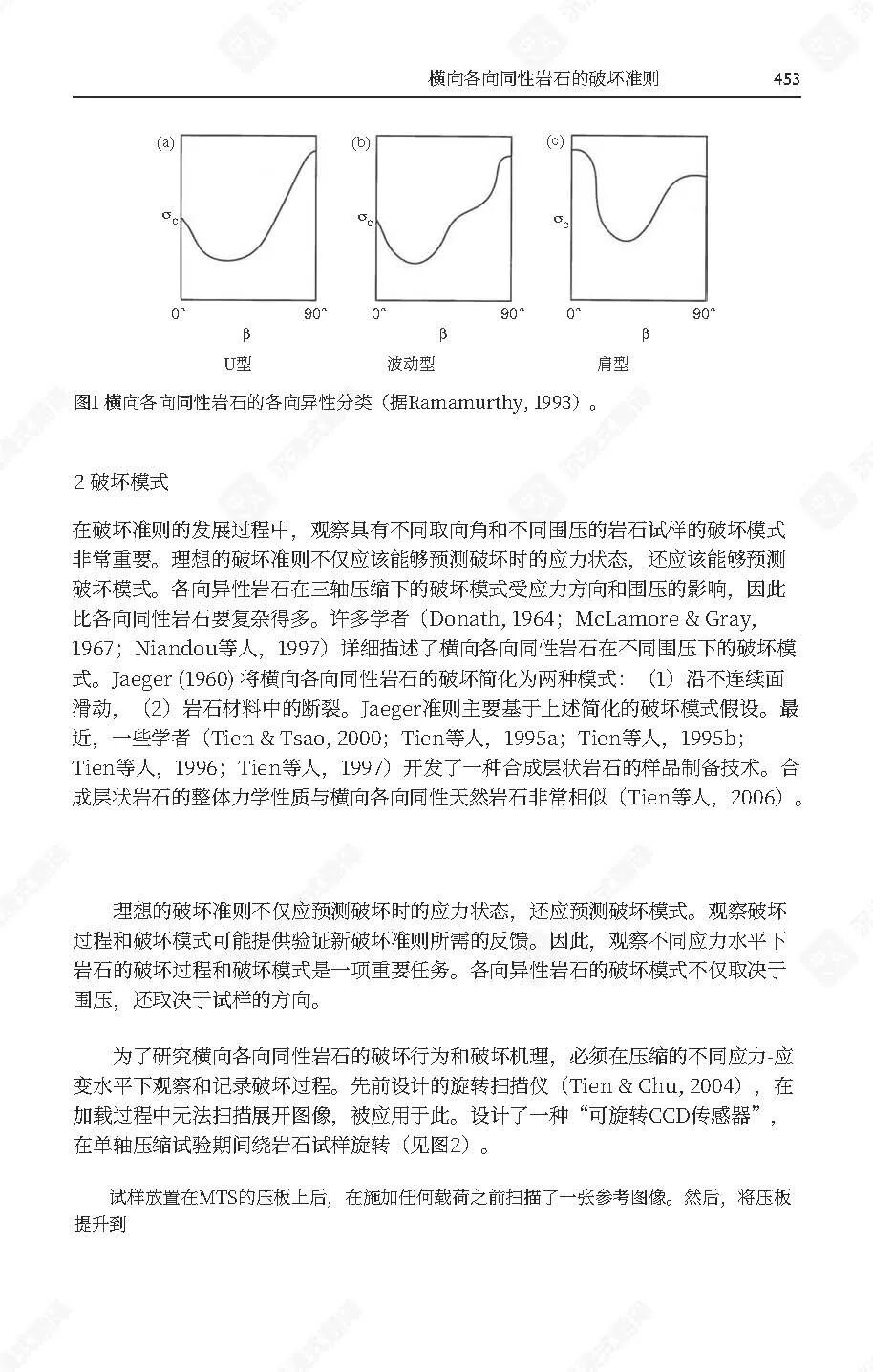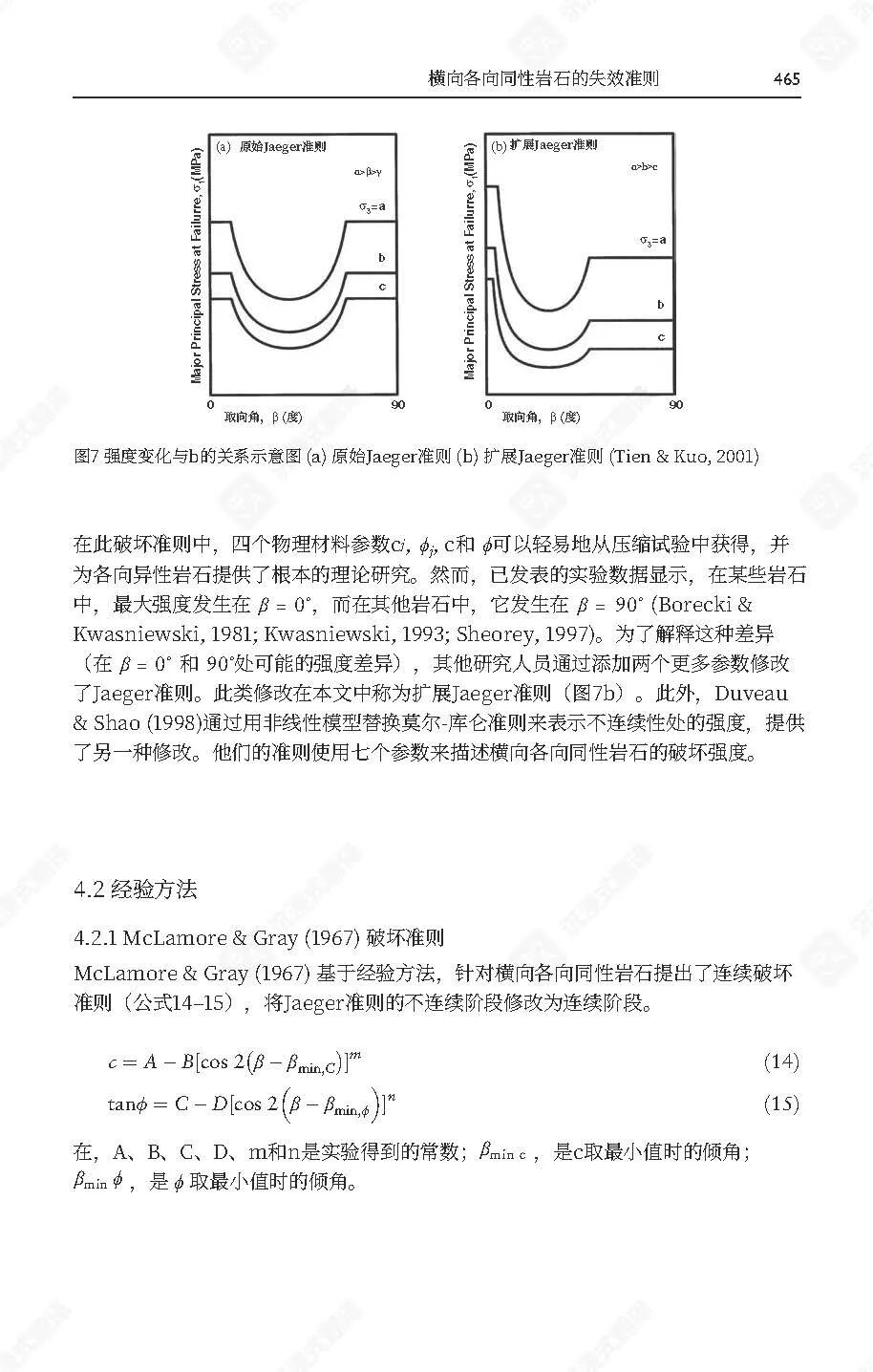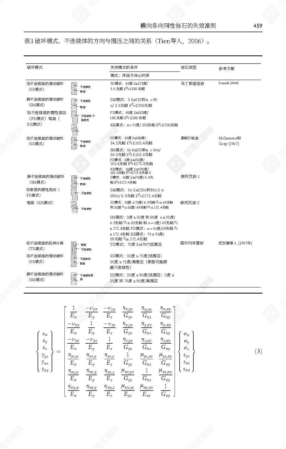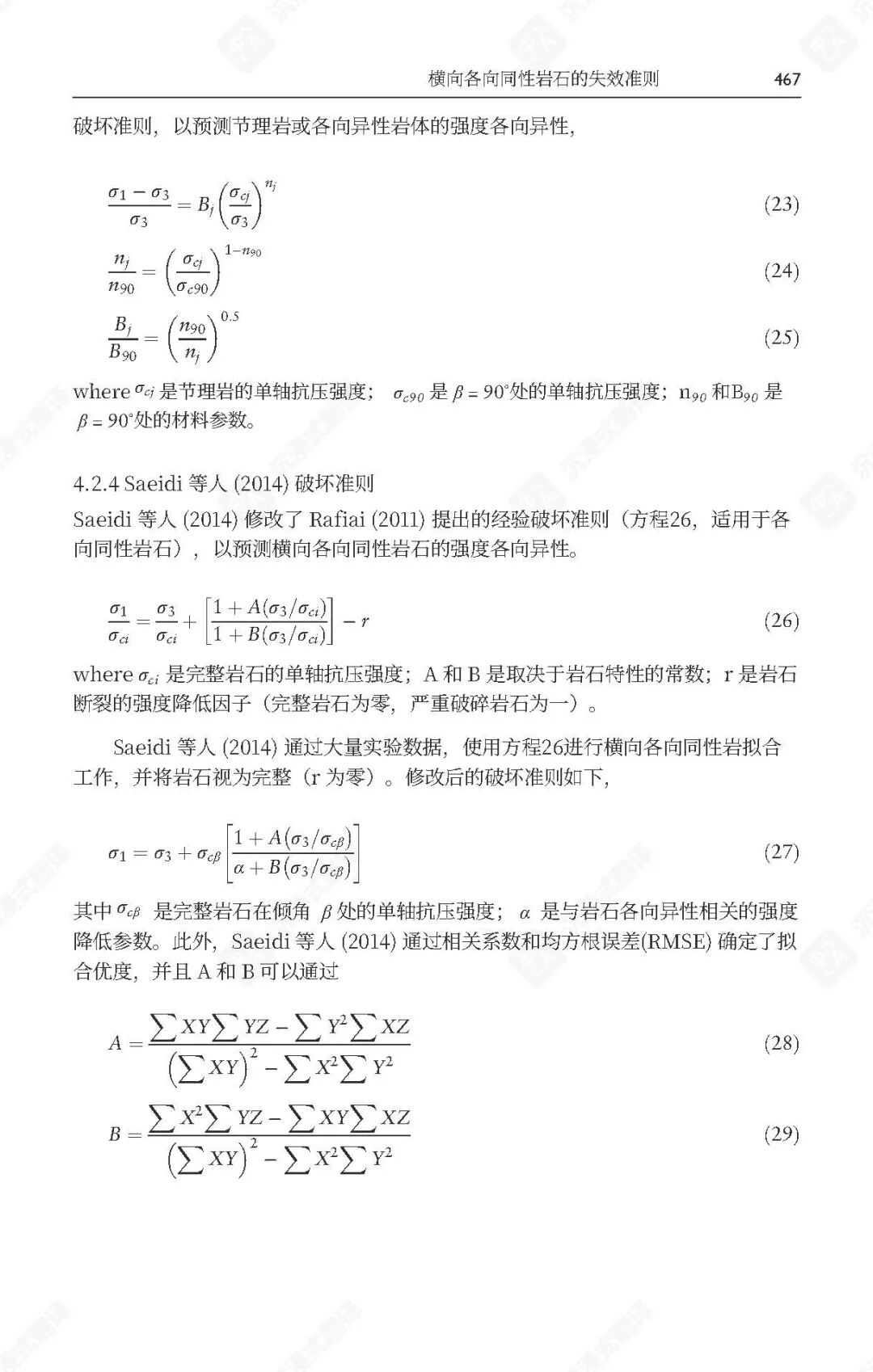 研究人员还提出了修正或抛物线失效准则。修正准则旨在通过考虑片麻岩、板岩、大理石、片岩、页岩、砂岩和石灰岩等各种变质岩和沉积岩的力学性质来确定横观各向异性岩石的强度。这种修正引入了一个反映强度各向异性的指数。还开发了一种简化的抛物线模型,通过修改完整岩石的常规抛物线准则,来预测不同围压和层理角下岩石的强度。该模型包含两个与层理角呈三角函数关系的方向依赖性参数。