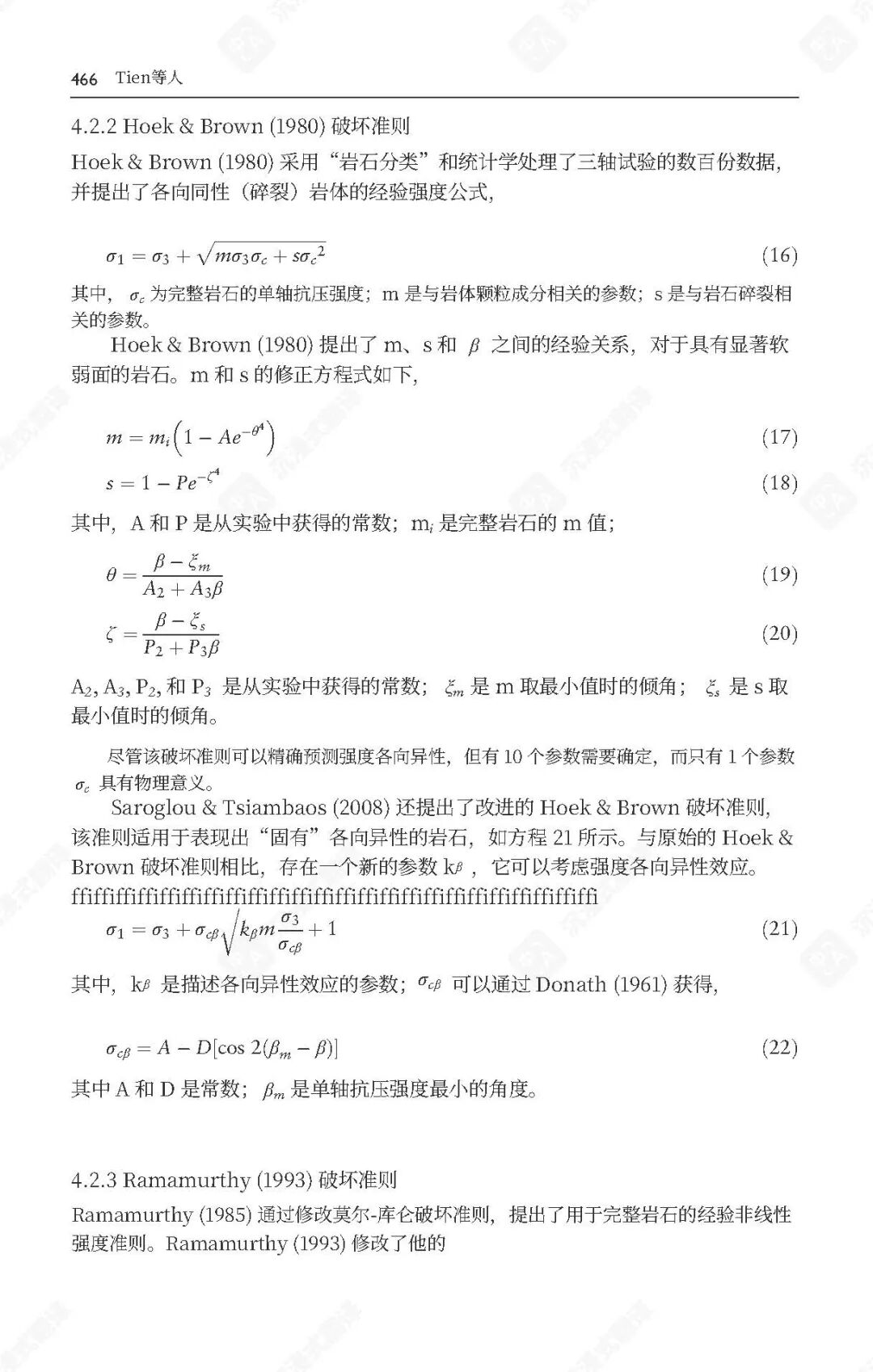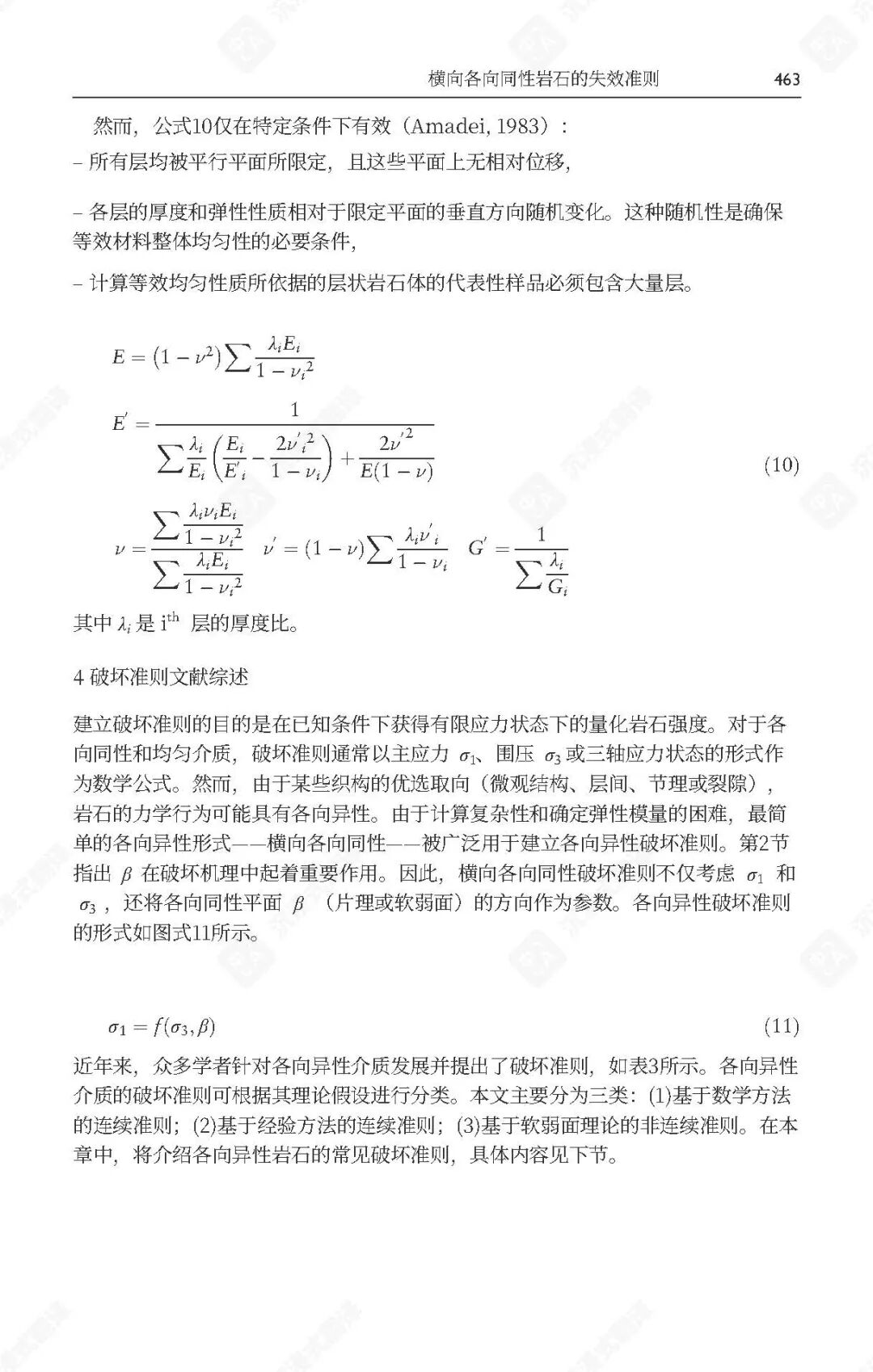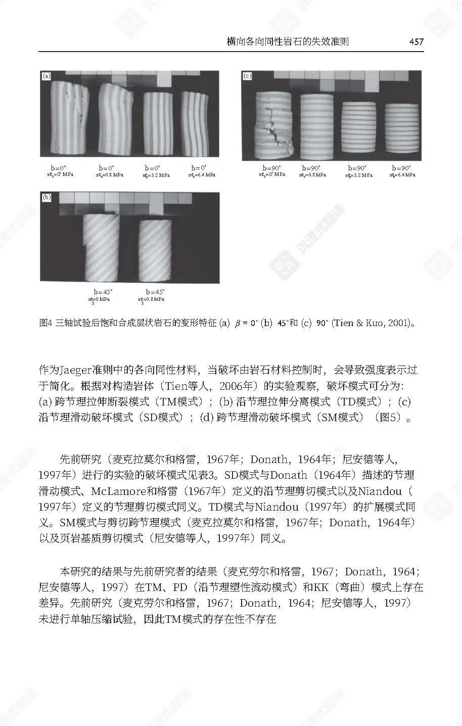 研究人员还提出了修正或抛物线失效准则。修正准则旨在通过考虑片麻岩、板岩、大理石、片岩、页岩、砂岩和石灰岩等各种变质岩和沉积岩的力学性质来确定横观各向异性岩石的强度。这种修正引入了一个反映强度各向异性的指数。还开发了一种简化的抛物线模型,通过修改完整岩石的常规抛物线准则,来预测不同围压和层理角下岩石的强度。该模型包含两个与层理角呈三角函数关系的方向依赖性参数。