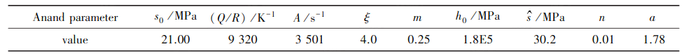 其中, s 为系数,n 为变形阻抗饱和值的应变率敏感指数. 根据上述 Anand 本构方程知,一共有 9 个参数:s0 ,Q,A,ξ,m,h0 ,s,n 以及 a, 各项数值 见表 4.