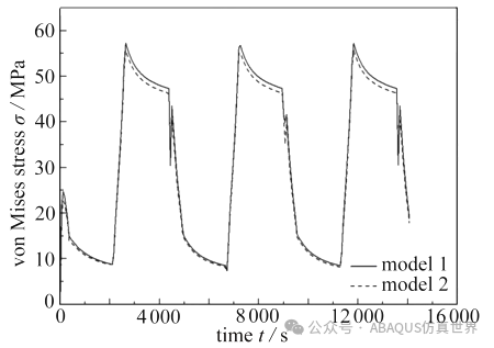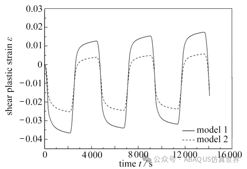焊点von Mises应力云图如图9,最大应力集中在边角焊点根部。模型1的等效应力稍大于模型2,如图10所示;模型1的塑性剪切应变范围也大于模型2,如图11所示。