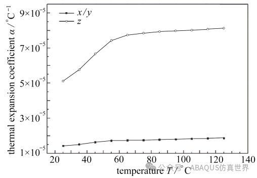温度T(℃) | x/y方向热膨胀系数(10⁻⁶/℃) | z方向热膨胀系数(10⁻⁶/℃) |