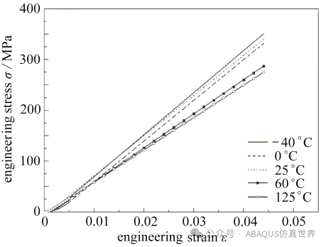 通过拉伸实验测定FR-4在不同温度下的弹性模量。实验选用带恒温箱的微机控制电子万能试验机,试样和仪器如图3所示,应力-应变曲线如图4所示。实验结果列于表1。