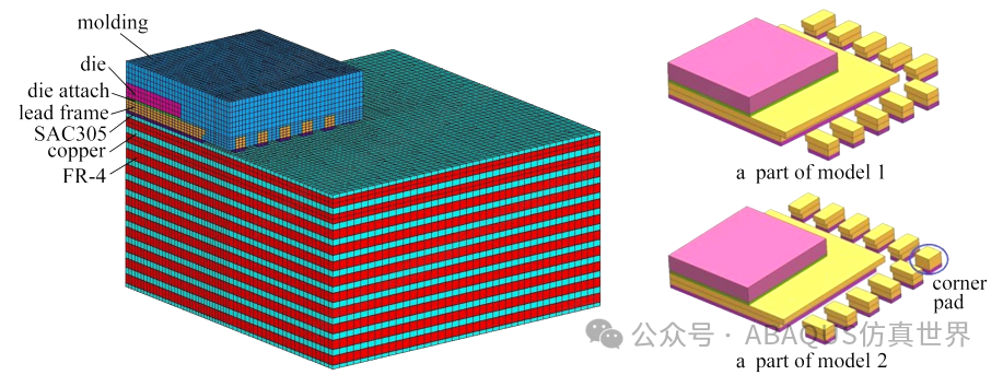 根据PCB实际结构,建立传统结构模型(model 1)和边角加锡块的改进模型(model 2)。两模型均由芯片、焊锡、铜层和FR-4层组成,考虑对称性,建立1/4有限元模型,如图7所示。