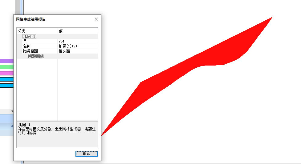 在统一划分网格的时候,发现对于某些实体是无法划分的,然后我们找到这个实体,单独划分一下网格。发现还是无法划分的,报错提示为相交面。