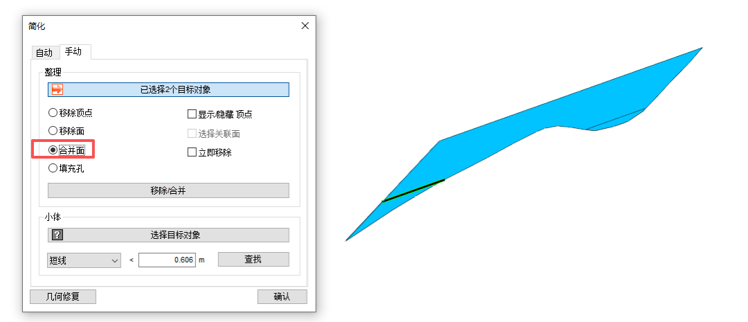 注意到这里的横向线实际与其他几何没有特殊的关联,也不是另外实体的边界线,可以在几何简化这里,找到合并面,选择这个位置的两根横向线,点击下方的移除/合并,就把这两根横线优化了,