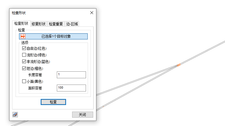然后我们放大观察一下这个位置的几何,一般来说网格划分失败都是因为短线、小面导致的。在几何的检查形状,设置短边为1m或者更加小,就可以看到在这个失效的网格组这里有一个短线,接下来我们可以优化一下这个位置的几何来查看一下可不可以使得这个几何能划分网格。