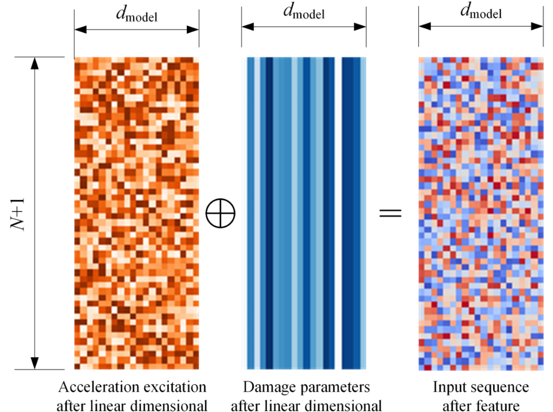 特征增强方法:采用加法特征增强,另一种可选方案是拼接法——将加速度激励与损伤参数经线性维度变换后沿特征维度拼接。为保持维度大小为 ,需先将加速度激励和损伤参数的特征维度降至 再拼接。