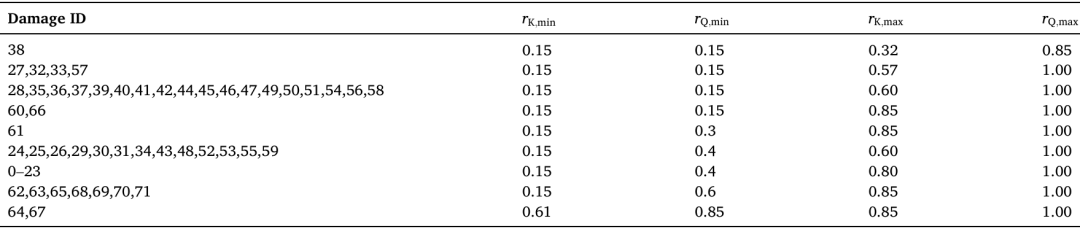 本案例中,逆向分析的优化问题可表述为:状态参数 定义为损伤参数 ,其包含所有柱端、梁端及剪力墙的刚度折减系数 与强度折减系数 。这是由于梁柱的宏观损伤通常发生在构件端部。混凝土主要贡献抗弯刚度,钢筋则提供强度。因此,在对应有限元模型中,刚度折减 应用于混凝土强度参数,强度折减 应用于钢筋屈服强度参数。通过堆叠所有构件的损伤参数,形成损伤参数向量: