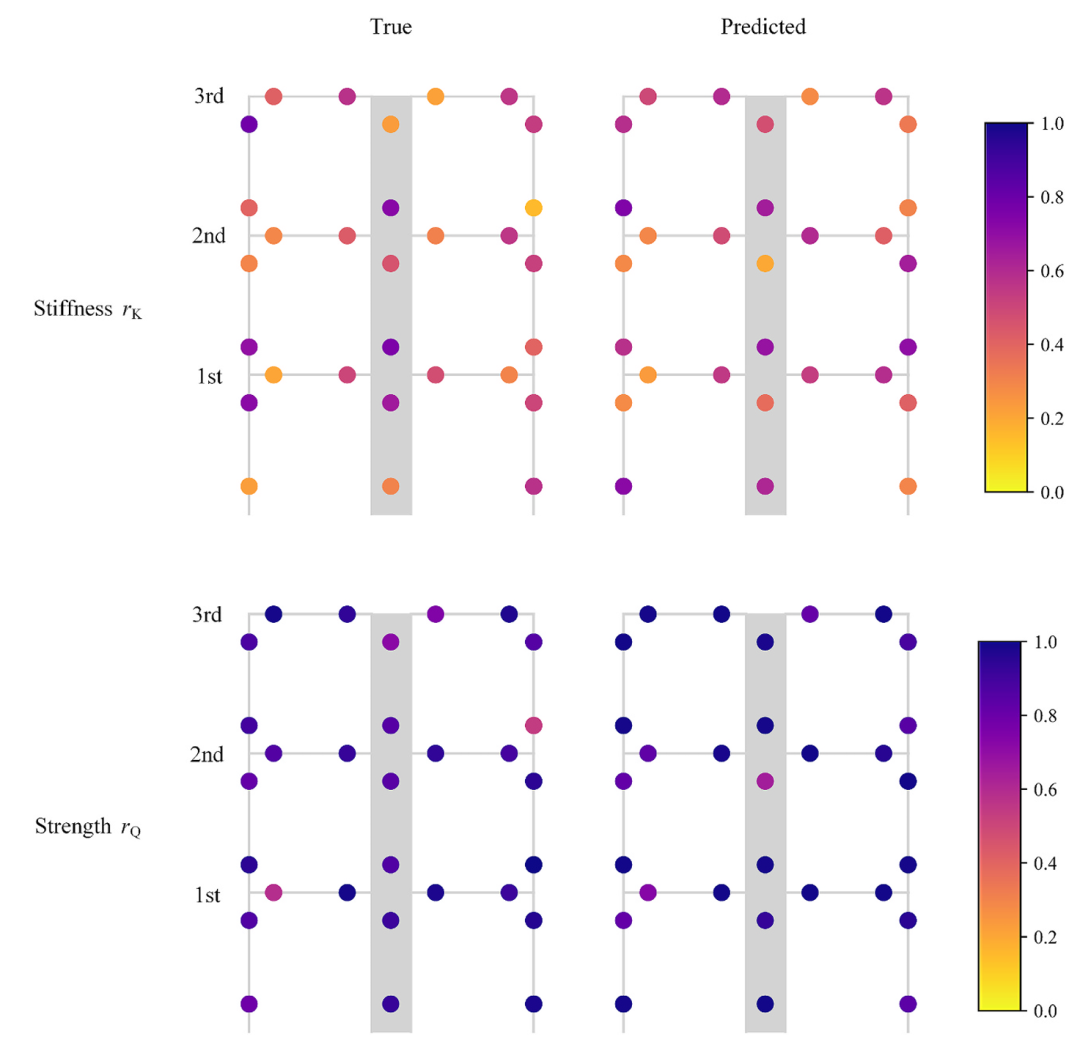图11给出了结构损伤参数的空间分布。为简明起见,主要展示了结构朝南面的真实值与预测值。颜色越深的圆点表示损伤参数越接近1,即损伤越轻。整体来看,刚度与强度削减系数均被合理估计。但在部分构件中,尽管整体损伤程度估计准确,构件两端的相对大小却出现反转。