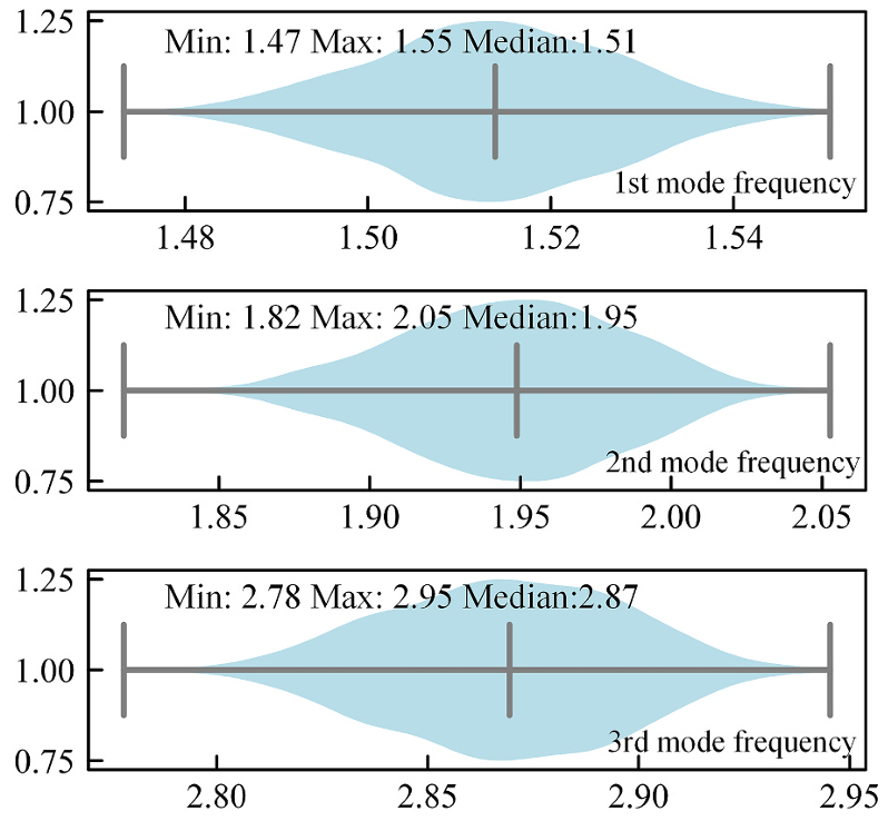 图 5 给出了1000组样本对应的前三阶自振频率分布。本研究中 特别关注第二阶模态频率,因为其代表了结构在x方向上的主要水平振动模态,而该方向亦为地震作用方向。第二阶模态频率范围为1.82 Hz至2.05 Hz,中位值为1.95 Hz。
