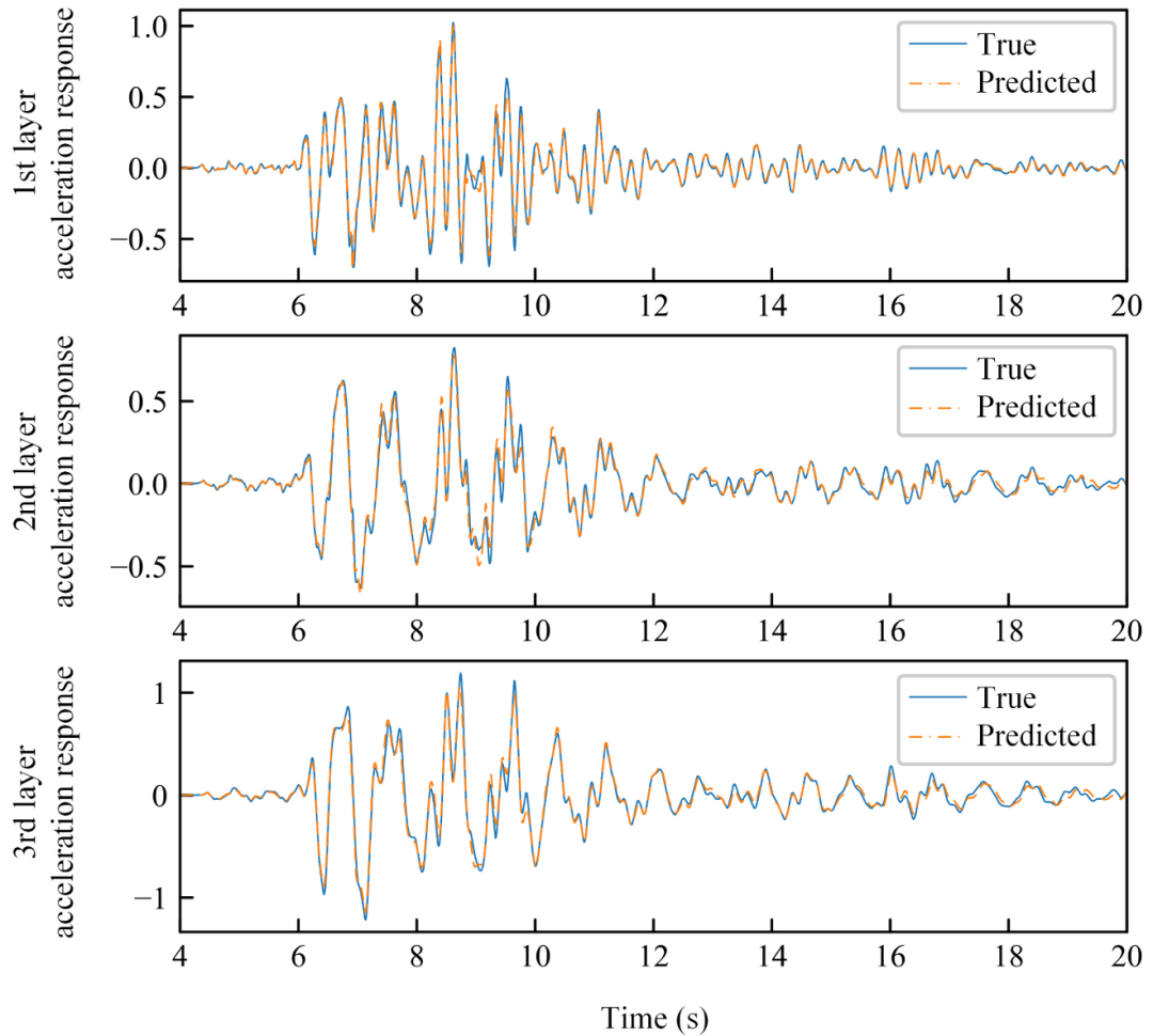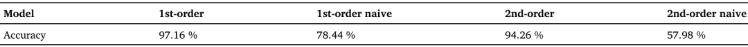 表 3 将两类代理模型的精度与朴素模型进行了比较。朴素模型仅通过复 制当前加速度来预测下一步响应,作为基线模型,任何有效的代理模型都应优于其表现。结果显示,一阶与二阶模型的精度均显著提升,能够有效捕捉损伤参数的影响。