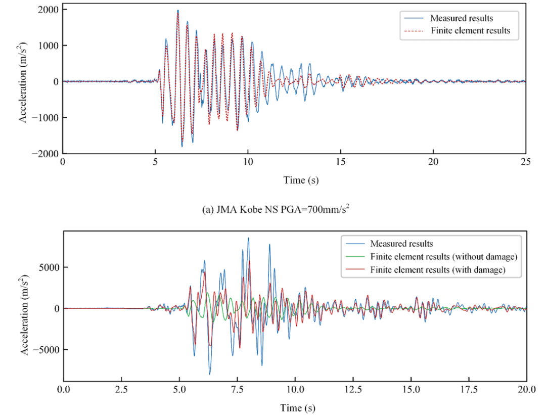 虽然有限元模型未直接集成到所提出的逆向分析框架中,但其用于生成训练深度学习代理模型所需数据。在建立有限元模型后,采用实测加速度时程数据验证模型有效性。图3对比了x方向 JMA Kobe NS 波激励下顶层加速度响应的实测值与有限元计算结果。图3(a)中峰值地面加速度(PGA)为700 mm/s²,属于常遇地震水平。由于结构在此荷载下预期基本无损伤,模型中未考虑损伤效应。在12秒至15秒之间存在偏差,这可能是实际结构中未在模型内考虑的轻微损伤所致。总体而言,计算加速度响应与实测数据基本吻合。