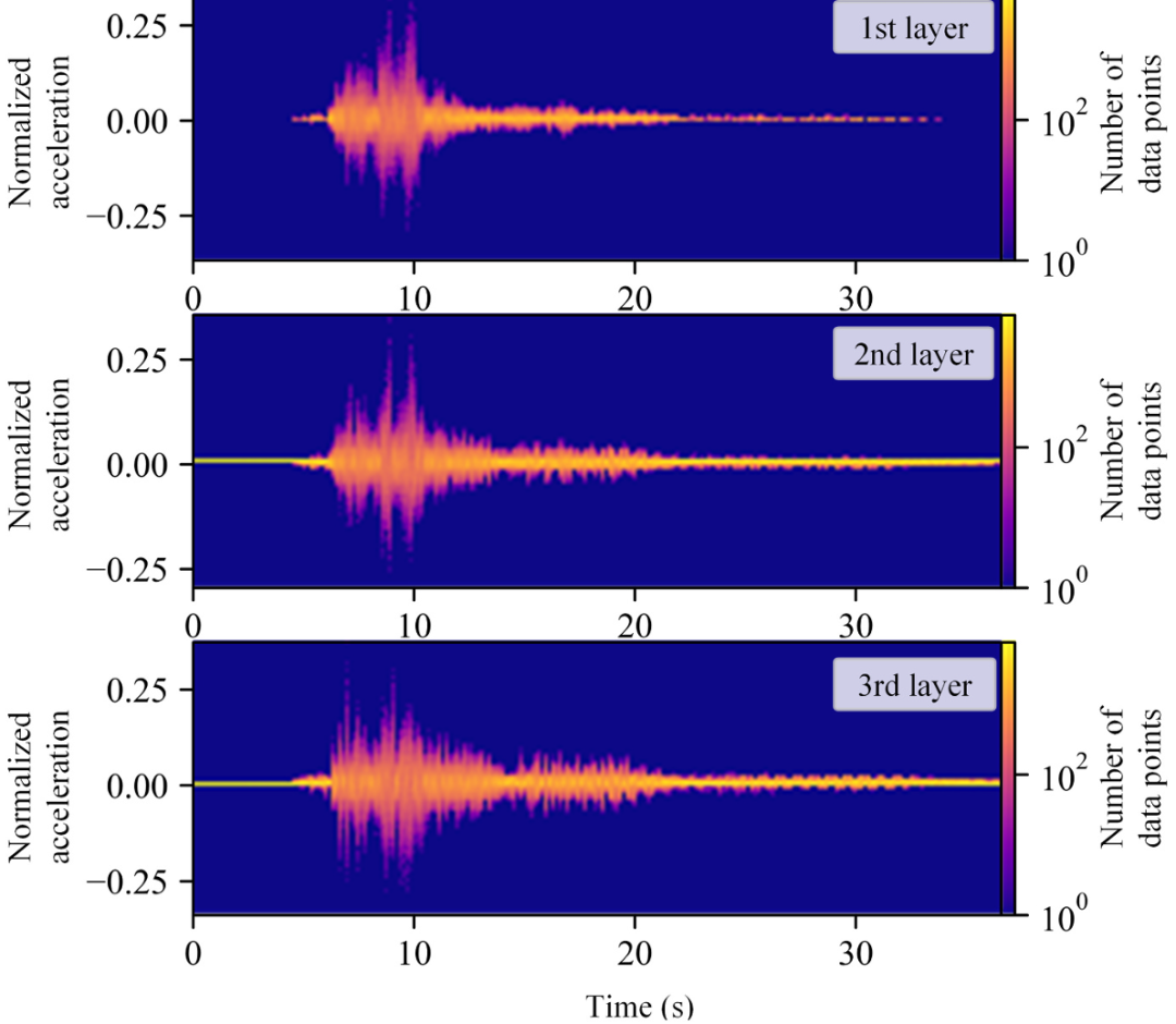 图 6 展示了各层归一化加速度响应时程的分布。加速度通过对输入地震动的PGA进行缩放并减去平均加速度以消除趋势实现归一化。横轴为时间步,纵轴为归一化加速度,亮色 区域表示数据点集中度较高。该分布呈现均匀且离散的特征,适合作为代理模型的训练数据。