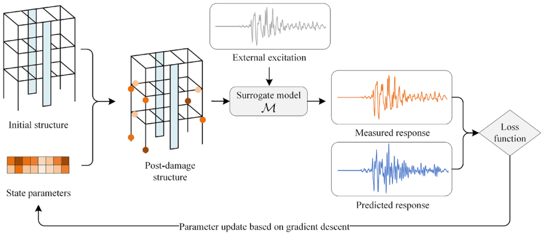 图 1 展示了本文提出的可微分反演分析框架。首先,为给定结构随机生成初始状态参数;随后将这些参数代入代理模型并施加外部激励(如地震作用);通过对比预测响应与实测响应,根据计算损失函数;最后基于损失函数进行梯度下降来更新状态参数。该过程迭代执行直至收敛。