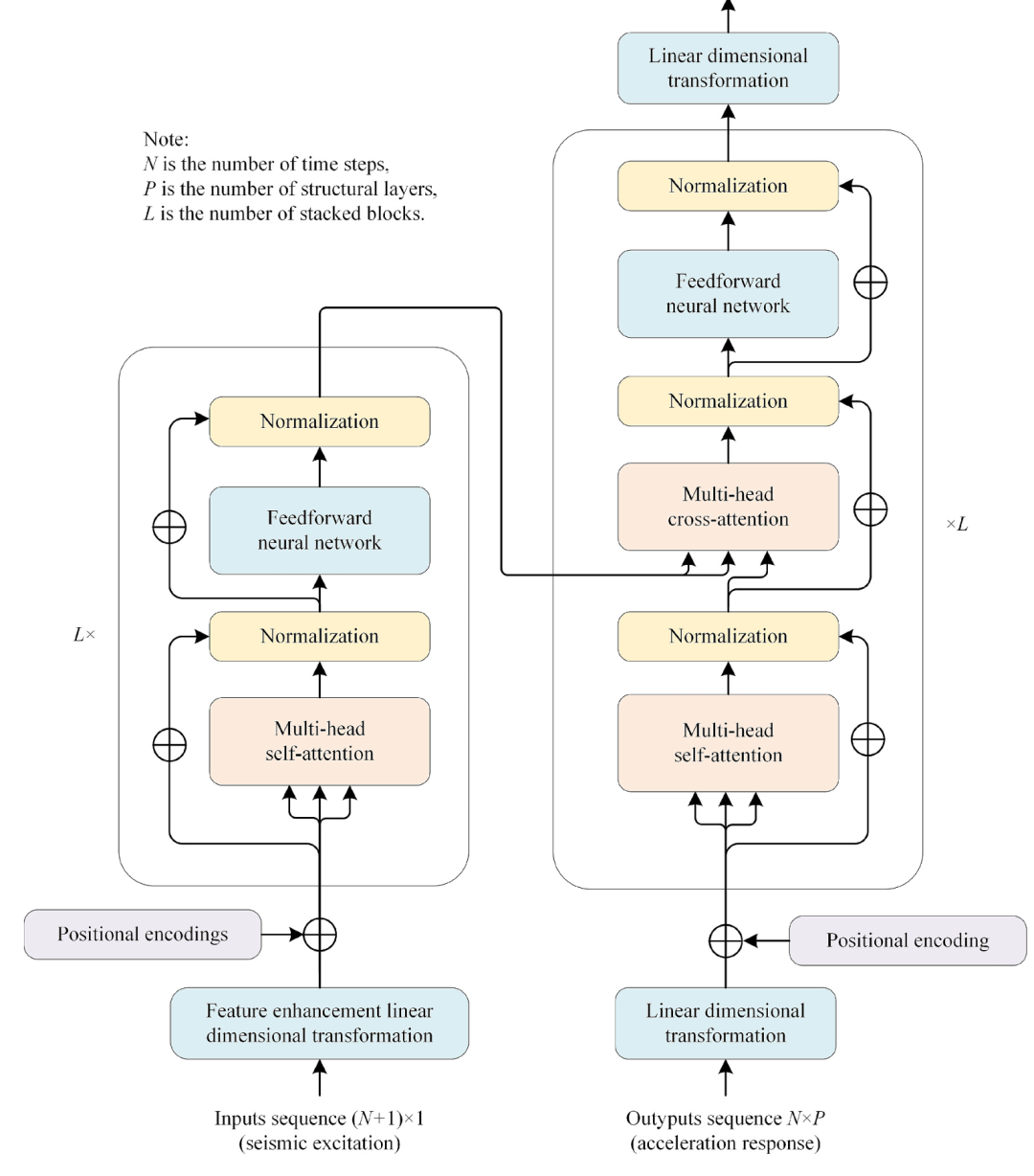 其中, 表示在时间步 的预测加速度响应。加速度响应代理模型基于 Transformer 架构构建,如图 7 所示。该架构是序列预测领域表现突出的深度学习模型。