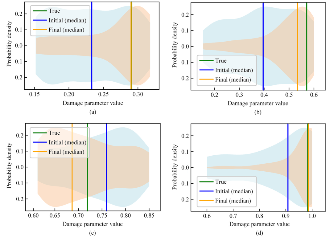 为更清晰展示更新前后的变化,对分布进行了对称化处理,并根据表1中的上下限对分布区间进行了截断。纵轴表示对应损伤参数值的概率密度。浅蓝色分布为初始状态,浅橙色为更新后的状态,绿色线为真实值,蓝色与橙色线分别为初始与最终分布的中位数。更新后,概率分布由均匀状态逐渐集中于真实值附近,中位数也更接近真实值。这表明多次模型更新能够降低损伤参数估计的不确定性。