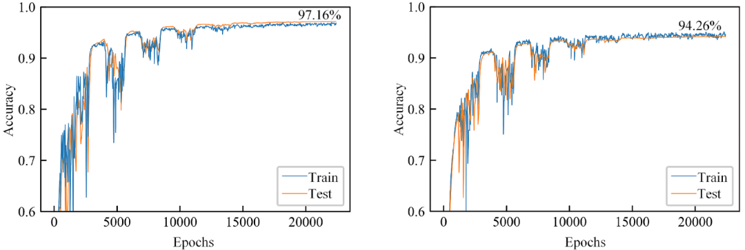 两类模型的训练曲线如图 9 所示。经过20,000次训练后,一阶模型在测试集上的精度达到97.16%,二阶模型则为94.26%。训练集与测试集精度接近,表明模型不存在过拟合。对比而言,一阶模型的训练确实比二阶模型更为容易。