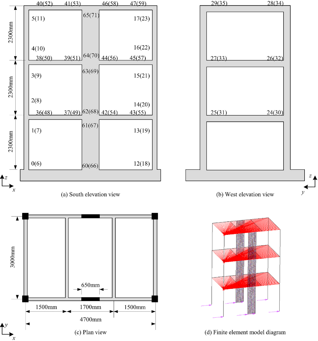 在先前研究中,对三层RC框架-剪力墙结构进行了振动台试验,采集加速度与位移时程数据。通过计算机视觉方法获取客观损伤参数,为本研究模型验证提供参考依据。试件共3层,每层高2300 mm,平面尺寸为4700 mm × 3000 mm。每层四角布置立柱,沿x轴方向设置剪力墙。楼板厚度80 mm,y轴方向次梁传递重力荷载。