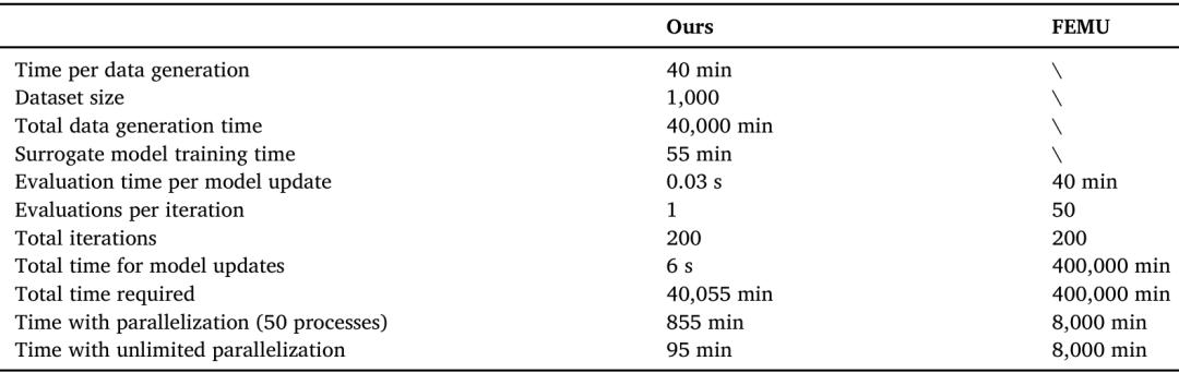 有限元并行计算可加速两种方法:本文框架通过缩短数据生成时间实现加速,而FEMU方法则通过减少每轮迭代中的模型评估时间实现加速。在50进程并行条件下,本文框架数据生成时间降至800分钟,总时间缩短至855分钟;FEMU方法则需8000分钟。若采用无限并行方案,本文框架总时间可进一步压缩至95分钟,但FEMU方法仍保持8000分钟(因每轮迭代仅需50次评估,并行度受限)。对比结果表明:相较于采用启发式算法的FEMU方法,本文提出的框架具有显著的时间效率优势。