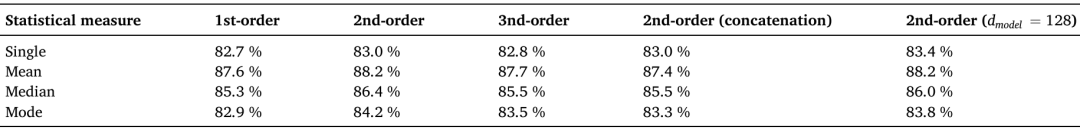 在特征增强方法方面,加法优于拼接法。对于相同二阶模型,加法最高精度达88.2%,而拼接法为87.4%。就模型维度而言,128维和64维的最高精度持平,表明维度大小对精度影响甚微。但需注意:128维模型参数量达1,424,771个,是64维模型(364,227个参数)的3.9倍。为节约计算资源,实际应用中建议将模型维度设置为64。