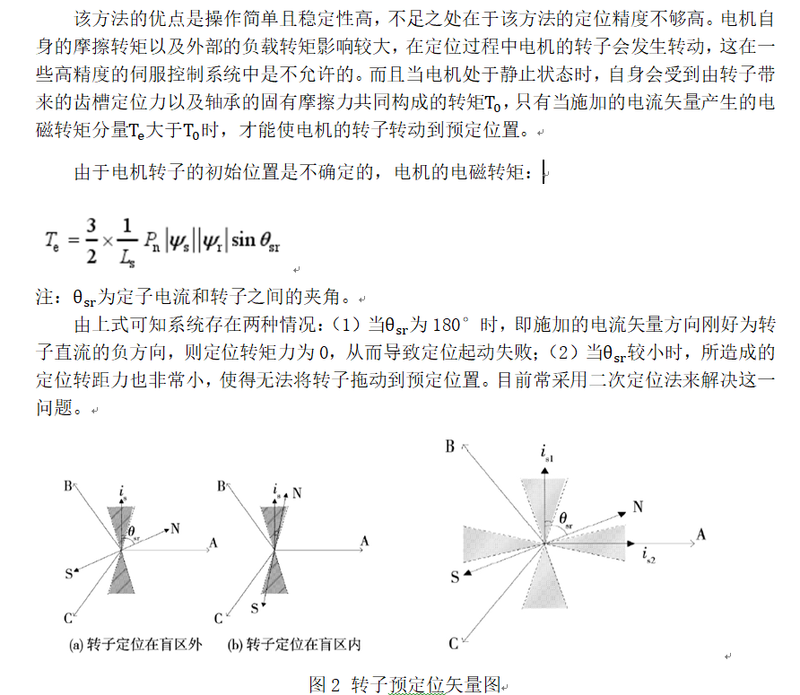 预定位的原理是通过对电机的定子绕组施加静止的电流矢量(固定角度和幅值),然后由该电流矢量所产生的电磁转矩将电机的转子旋转到预定位置。