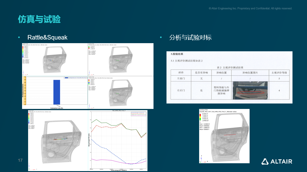 车门异响问题过去往往只能依靠试验排查,如今我们引入了 Altair SnRD 模块来进行仿真分析。将 PSD 曲线导入后,我们结合 CBUSH 单元模拟卡扣连接刚度,考虑不同材料对 squeak 和 rattle 的响应行为,对扶手和拉手区域的异响风险进行了预测。其中一个摩擦异响的风险点经软件标记后,我们在实物试验中确实听到了异常噪音。最后通过结构加固和材料调整成功消除,为我们将问题前置解决提供了重要支撑。
