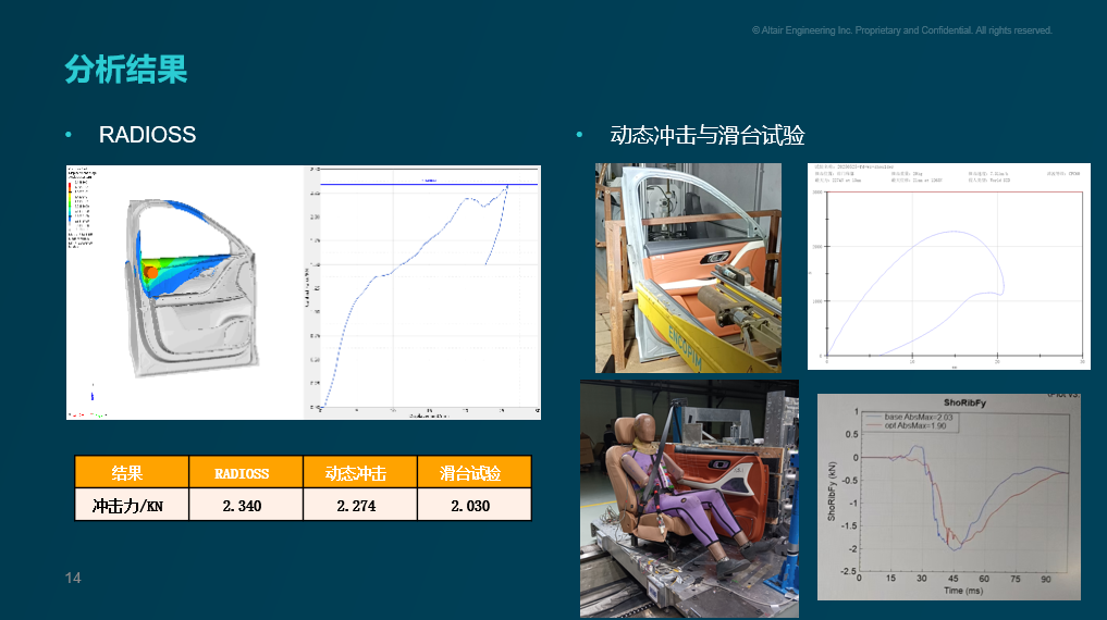 除了静态结构性能,汽车车门总成的动态冲击测试也是验证舒适性和安全性的关键一环。我们利用 Radioss 搭建了车门总成冲击仿真场景,模拟实车不同假人不同位置对车门内饰总成碰撞,为整车侧碰和柱碰提供参考。通过与滑台试验和动冲工装试验的对标,我们验证了仿真模型在动态响应方面的准确性,确保冲击力预测与实测误差在合理范围内。