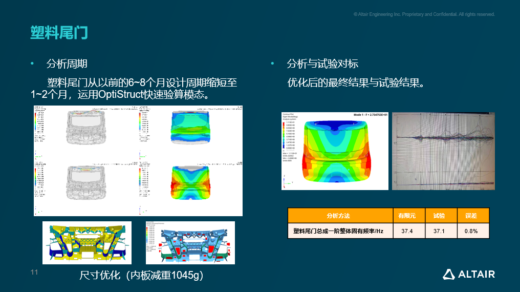 在我们的塑料尾门项目中,最大的挑战是如何在大幅减重的同时,满足结构刚度与模态目标。借助OptiStruct,我们构建了完整的实车仿真模型,进行了结构优化和尺寸优化。通过反复验证和局部加强设计,尾门模态从初始的20Hz 提升到27Hz以上,顺利达到项目目标。同时,我们还成功减重1045g,减重后的结构在实车模态实验中的误差仅为0.3Hz,仿真精度令人非常满意。
