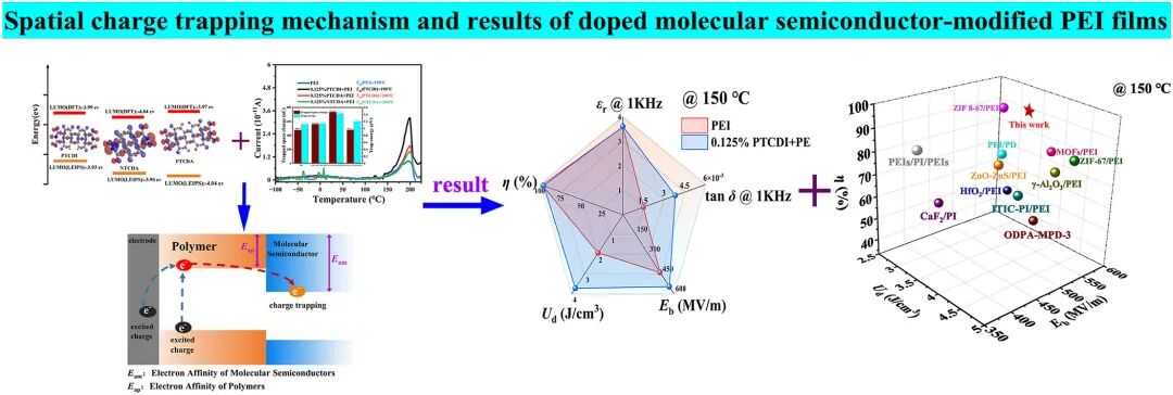 Polyetherimide (PEI), as a kind of high-temperature dielectrics, still face the issue of current leakage under thermo-electrical coupling fields, leading to a sharp degradation of energy storage performance. In this study, an intrinsic PEI with superior comprehensive properties was synthesized using 4,4'-(4,4'-isopropylidenediphenoxy)bis(phthalic anhydride) (BPADA) and 2,2-bis[4-(4-aminophenoxy)phenyl] propane (BAPP). Through molecular design, an "electron gate" mechanis m was introduced via σ-π hyperconjugation effects, effectively suppressing long-range charge delocalization. The resulting intrinsic PEI achieves an energy storage density (Ud) of 1.93 J/cm3 at 150 °C, which is 20.6% higher than that of commercial Ultem™ PEI film (1.6 J/cm3). Further modification was conducted by doping with three molecular semiconductors: 3,4,9,10-perylenetetracarboxylic diimide (PTCDI), 1,4,5,8-naphthalenetetracarboxylic dianhydride (NTCDA), and 3,4,9,10-perylenetetracarboxylic dianhydride (PTCDA). Density Functional Theory (DFT) simulations and Low-Energy Inverse Photoemission Spectroscopy (LEIPS) experiments reveal that all three semiconductors exhibit higher electron affinity than the intrinsic PEI. Additionally, Thermally Stimulated Depolarization Current (TSDC) reveals that the incorporation of molecular semiconductors increases trapped charges and trap energy level compared to intrinsic PEI. Both experimental and simulation results consistently demonstrate that molecular semiconductor doping can enhance energy storage performance by constructing deep trap sites within the PEI matrix. Experimental results demonstrate that at 150 °C, the 0.125% PTCDI-doped PEI achieves a breakdown strength of 545 MV/m, an Ud of 3.71 J/cm3, and a charge-discharge efficiency (η) of 90.13% (vs. 436 MV/m, 1.93 J/cm3, and 94.67% for intrinsic PEI). This research provides an effective strategy for improving the capacitive performance of polymer dielectrics under thermo-electrical coupling conditions.