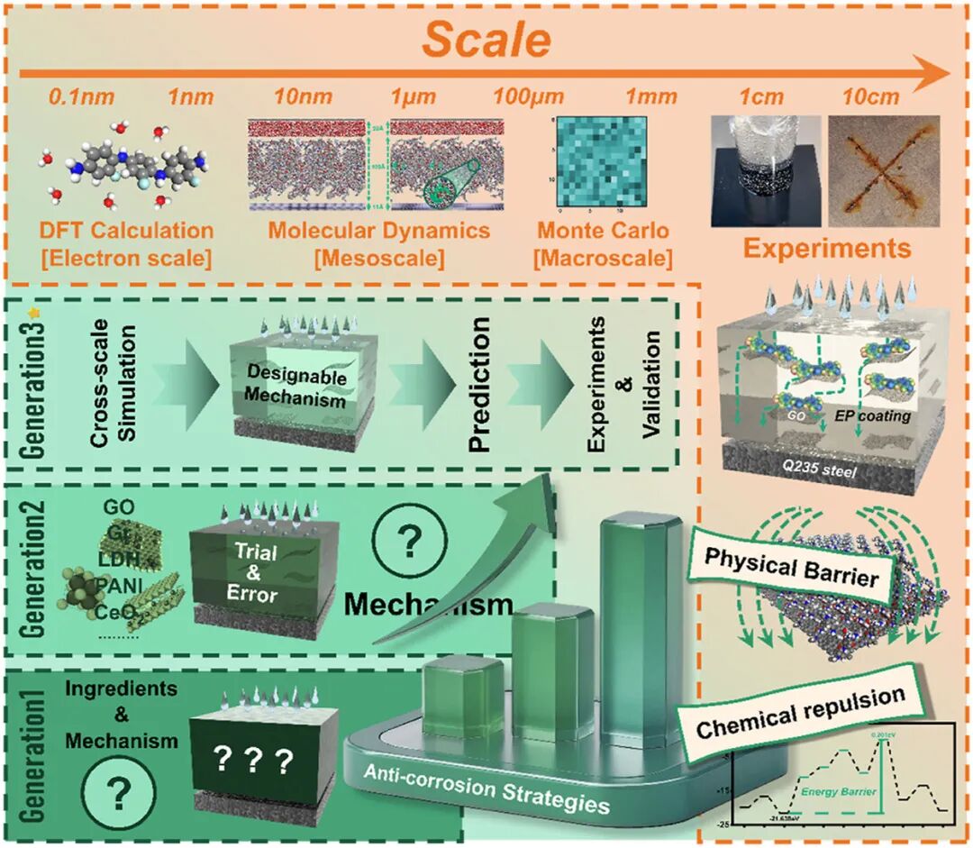 在恶劣的潮湿环境下,传统的环氧涂料由于固化过程中形成微孔缺陷,其耐腐蚀性不足,而填料的试错优化则面临着机理不明确、设计效率低等挑战。本研究提出了一种新的“计算驱动的材料设计”范式,通过跨尺度模拟阐明了填料的协同抗湿机制。分子动力学(MD)模拟表明,添加3 wt%的氧化石墨烯(GO)可使环氧树脂的自由体积减少15%,水扩散系数降低10%。密度泛函理论(DFT)计算发现,聚氟苯胺(PFAN)中的氟基团通过电子云重分布产生了较高的吸附能垒(21.831 eV),有效抑制了水的渗透。蒙特卡罗(MC)模拟进一步用宏观穿透通量架起了微观能垒的桥梁。在这些见解的指导下,通过共价接枝合成了还原氧化石墨烯-聚氟苯胺(rGO-PFAN)复合填料,实验证明了协同疏水屏障效应。含有1.5 wt% rGO-PFAN的环氧涂料在浸泡90天后仍能保持4.44×1011 Ω·cm2的阻抗模量,而含有2 wt% rGO-PFAN的环氧涂料可使长期吸水率降低73.63%。盐雾试验证实在缺陷区域具有较好的耐蚀性。力学性能测试表明,热循环后涂层磨损明显减少,附着力增强,附着力良好。这项工作开创了从电子云相互作用到宏观防腐性能的多尺度关联,为极端环境下智能涂层的合理设计建立了理论框架。