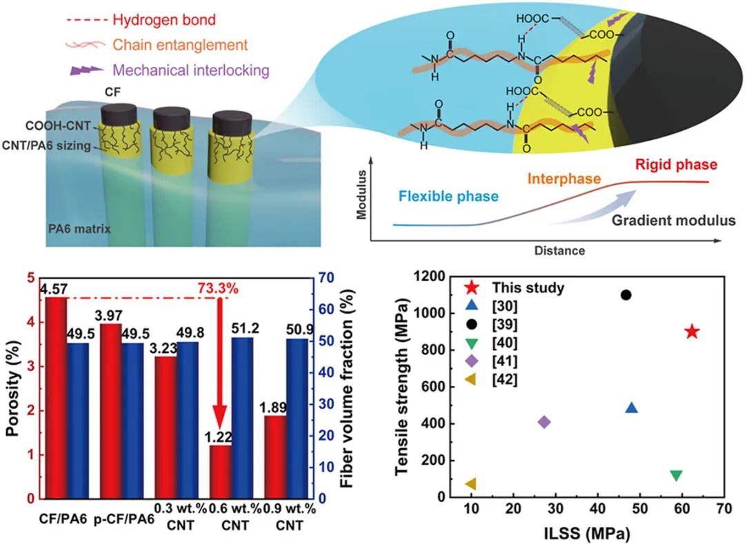 CF/PA6复合材料中梯度模量界面相的连续构建增强了界面性能并降低了孔隙率