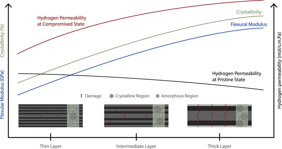 用于 V 型储罐的气体储存的热塑性复合材料的潜力仍有待全面评估。然而,我们证明了对于薄层碳纤维增强聚酰胺 6(CF/PA6)复合材料,其氢渗透性与其微观结构有很强的依赖性。在 5、10 和 15 巴的氢气进料压力下,对层厚分别为 42 微米、84 微米和 168 微米的正交层压板进行了测试,测试状态包括原始状态和通过拉伸加载至极限强度的 60% - 80% 而产生的预损伤状态。在原始状态下,薄层层压板由于结晶度较低、无定形含量较高以及弯曲模量较低而表现出更高的渗透性。厚层层压板具有更大的结晶域,形成了更曲折的扩散路径,从而导致渗透性更低。压力的增加通过氢诱导结晶降低了渗透性。薄层在早期就出现损伤,在高应变下保持稳定的损伤含量,从而确保了允许的渗透性,而厚层则在初始阶段抵抗损伤,但在高应变下性能下降,渗透性显著增加。这些发现突显了微观结构对氢气传输的影响,并为使用薄层碳纤维/尼龙 6 复合材料在 V 型储罐中安全储存氢气提供了关键的设计见解。