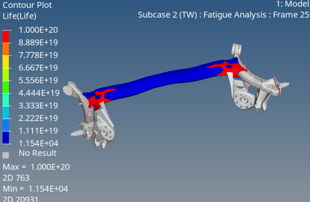 疲劳失效是扭力梁在长期使用过程中的主要失效形式,HyperWorks 通过载荷谱加载与材料 S-N 曲线结合,实现扭转疲劳寿命的精准预测。上图中疲劳寿命云图部分直观展示了寿命分布差异:扭力梁最小疲劳寿命为 1.15 万次(2D 单元 20931 处,云图中深紫色预警区域),最大寿命超过 1×10²⁰次(2D 单元 763 处,云图中绿色安全区域),寿命分布差异显著。