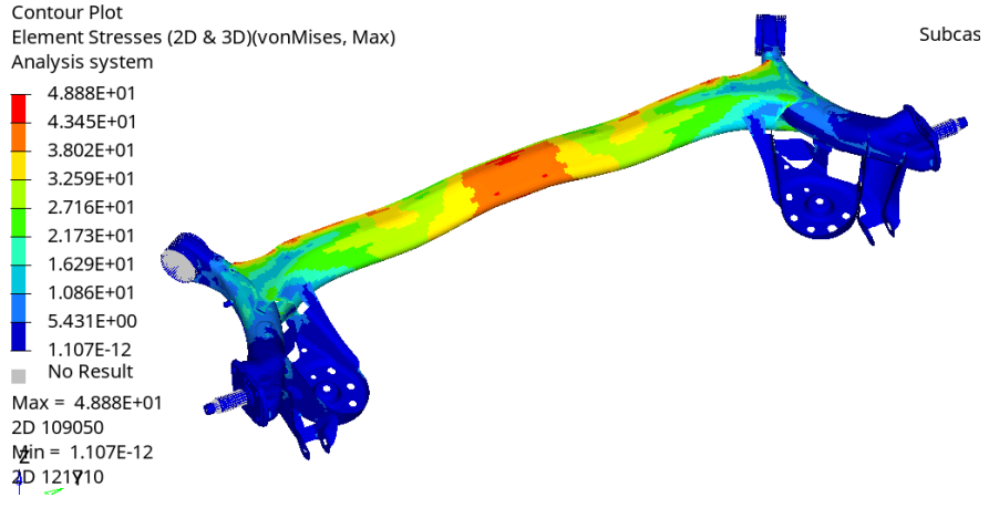 在本体刚度分析中,结合上图应力云图可见,最大应力值为 48.88MPa(2D 单元 109050 处,对应云图中红色高亮区域),最小应力接近 0(2D 单元 121910 处,对应云图中蓝色低应力区域),应力分布呈现“两端低、中间高”的特征,符合扭力梁在扭转工况下的受力规律。这一结果验证了当前结构在静态刚度方面的合理性,同时也为后续优化局部薄弱区域提供了明确方向。