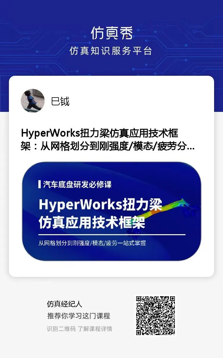 为了帮助读者更好理解和掌握这种分析能力,我的HyperWorks扭力梁仿真实战课程详细介绍了如何使用hyperworks软件对扭力梁本体进行网格划分以及剪切中心、扭转刚度、模态频率和扭转疲劳的详细仿真过程,step by step实例视频教程,附件包含练习文件,感兴趣可跟做~,请识别下方二维码试看。