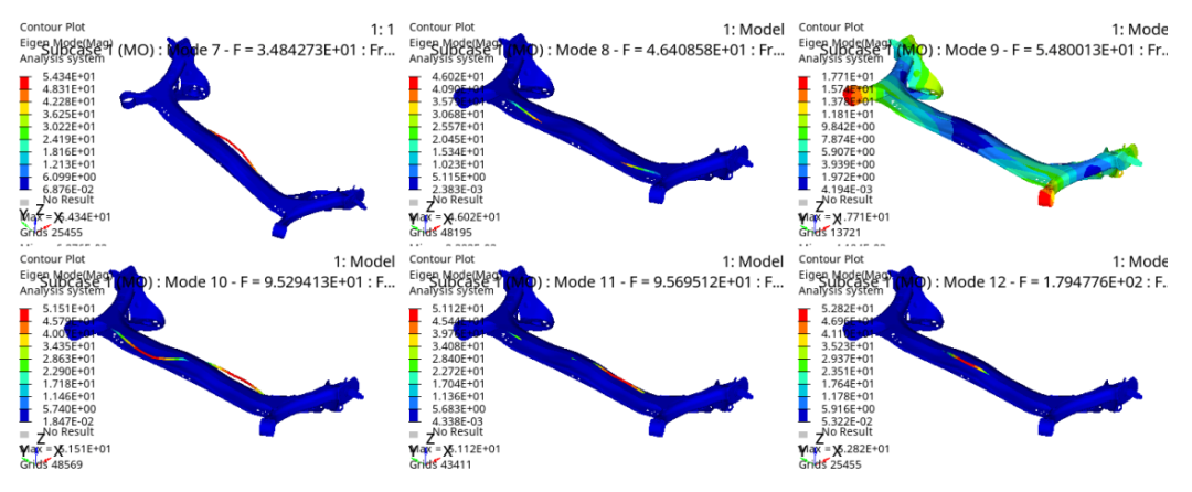 从结果来看,前三阶模态频率间隔均匀,结合上图振型分布可判断无明显共振风险;四阶与五阶模态频率接近(差值仅 1.4Hz),对应上图中两种振型的相似变形区域,需重点关注该频段是否与车身或动力总成的振动频率重叠,防止共振产生;六阶模态频率跃升至 179.5Hz,远超日常行驶工况下的激励频率,从上图中该阶振型的局部小幅度变形也可看出,其对整车 NVH 性能影响较小。通过模态分析,设计人员可针对性调整扭力梁的质量分布或刚度分布,优化模态频率,提升整车动态性能。