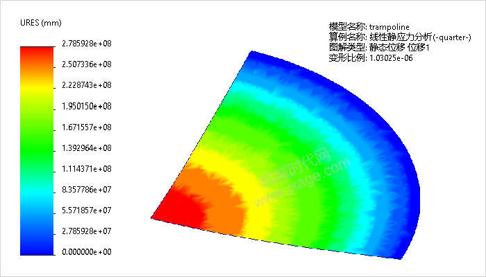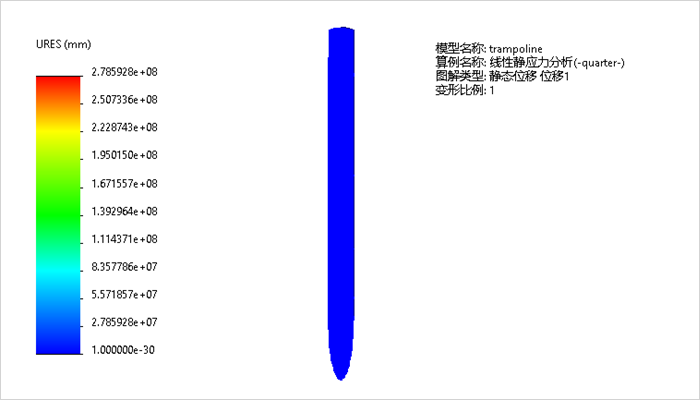 10.图解显示位移结果。展开结果文件夹并双击默认的静态位移 位移1,注意右上方的默认的【变形比例】远小于1,说明当前的变形是缩小的,实际的变形量如左侧的图例所示,达到2.7859e+08mm,非常大,因此该结果是不真实的。
