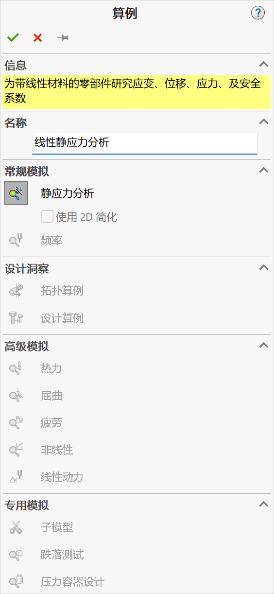 2.点击【新算例】,在【名称】中输入“线性静应力分析”,【类型】选择“静应力分析”。