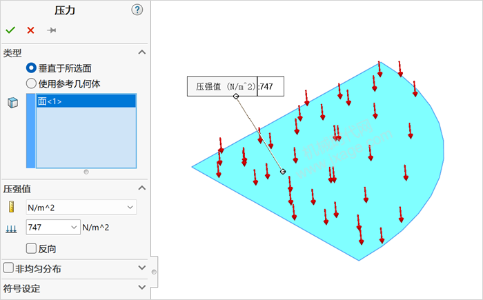 通过对顶面添加一个747Pa的均匀压力来代表蹦床上76mm深的水。在蹦床顶面上添加一个压强为747N/m2,类型选择【垂直于所选面】。