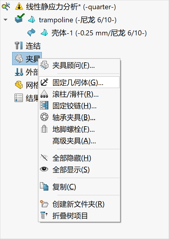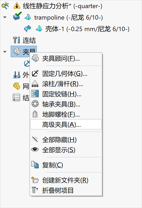 6.在Simulation分析树中右键单击夹具并选择高级夹具,如下图所示。