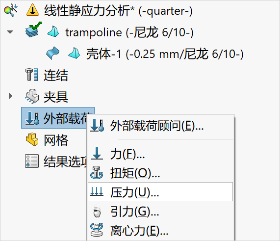 8.添加压力载荷。选择外部载荷,鼠标右键选择“压力”。